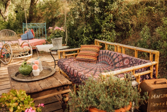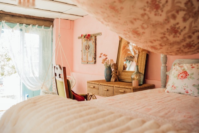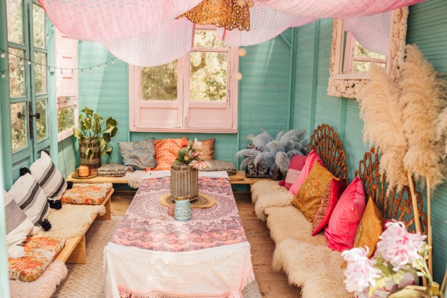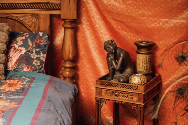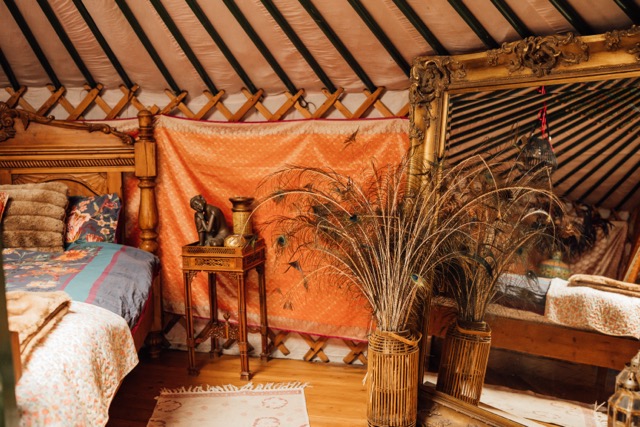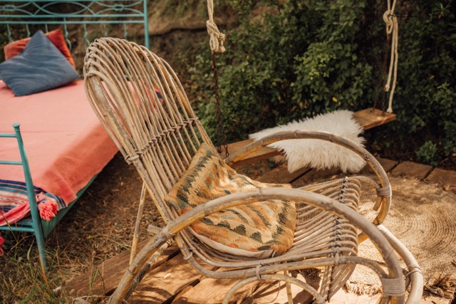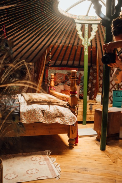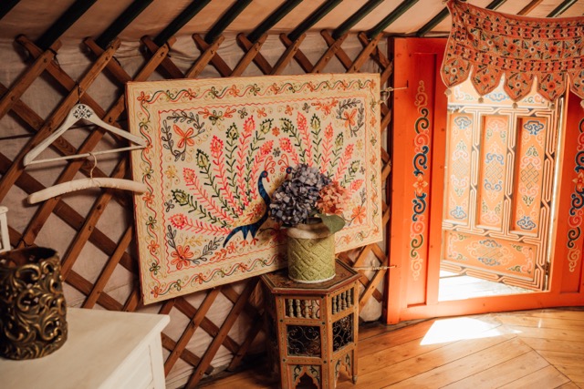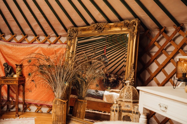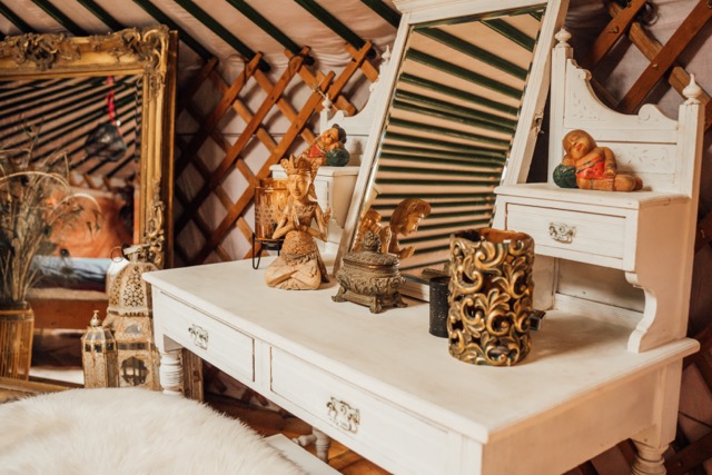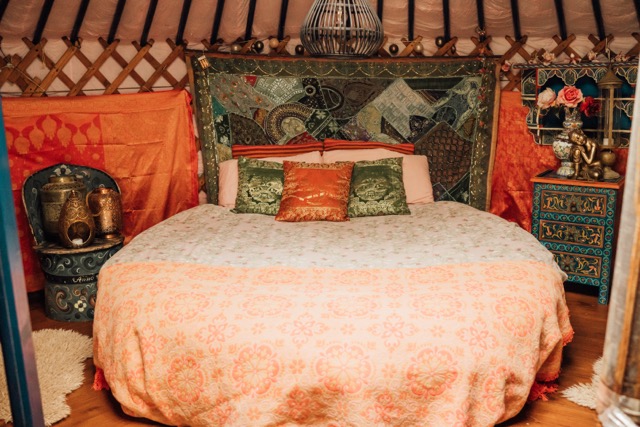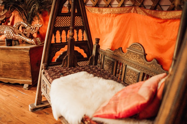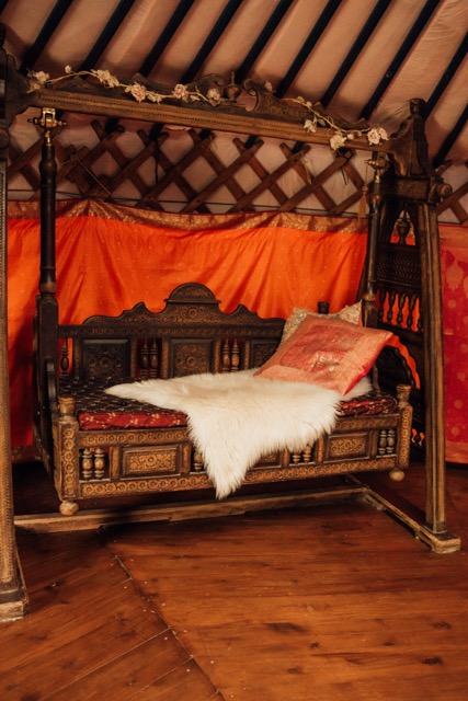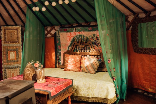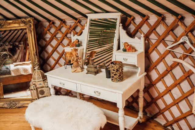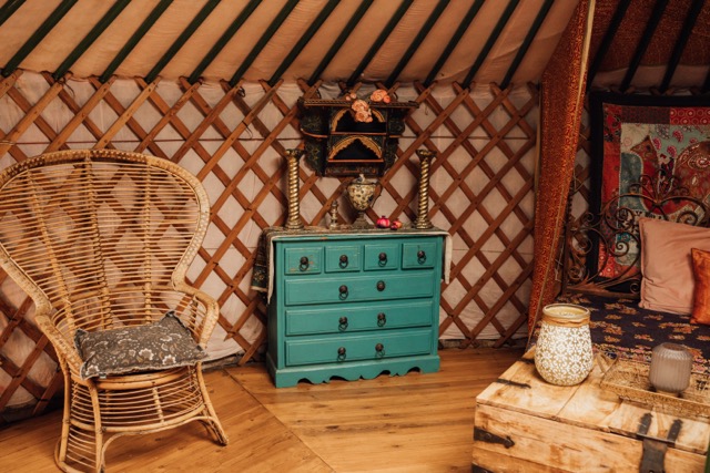 Outside, you’ll find a comfy outdoor bed, sofa and a little swing. Lola has her own compost loo and washbasin and shares the outdoor shower area with Yurt Pomegranate.