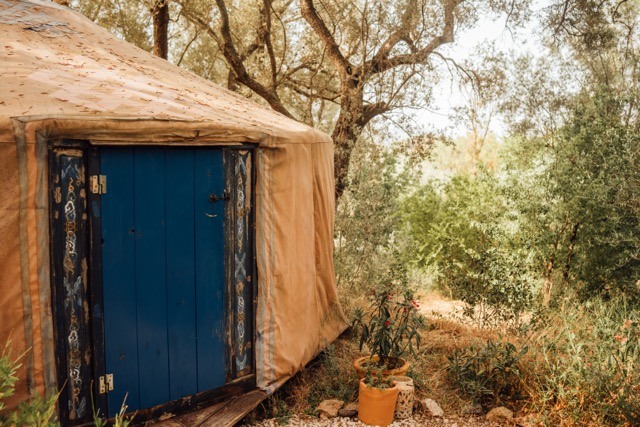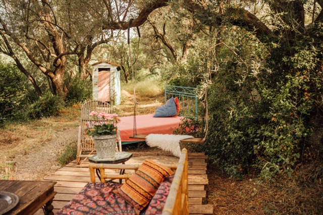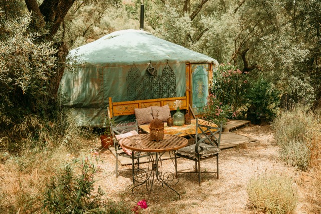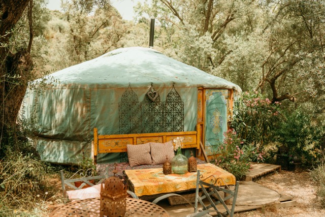 Shaded, serene, and full of charm. Nestled in its own little dingly dell beneath ancient olive trees, Yurt Lola is a tranquil hideaway made for rest and relaxation. She features soft earthy tones, a wood burner for cool evenings, and her own private deck surrounded by greenery.