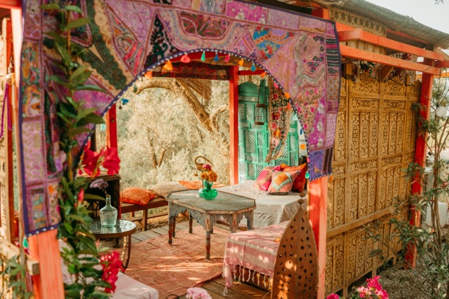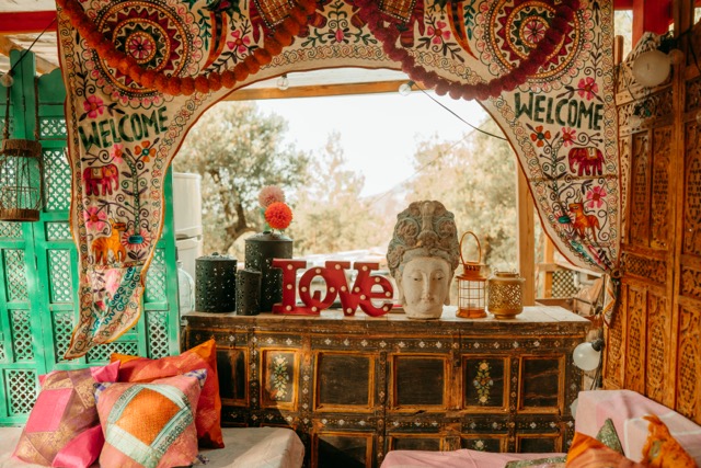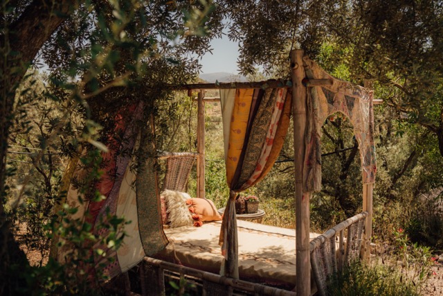 For dreamers and stargazers. Tucked in the sheltered barranco under towering olive trees, Yurt Pomegranate has been lovingly refreshed with warm textiles, candlelight, and rustic touches. It includes a private seating area and a comfy outdoor bed for stargazing.