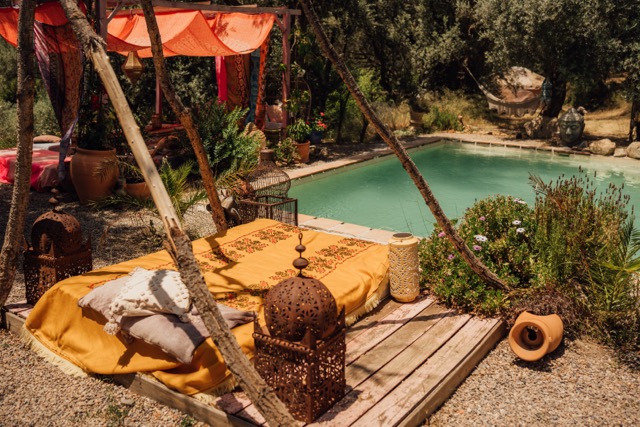 At the heart of the site is our beautiful pool area — surrounded by olive trees and furnished with four-poster daybeds, shaded nooks, and candlelit corners. There’s also an outdoor dining area, a fully equipped self-catering kitchen, and plenty of chill-out spots.