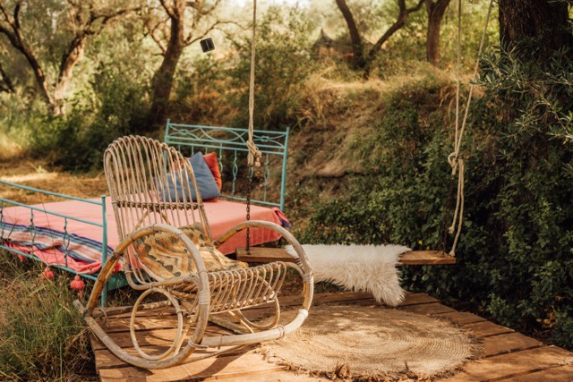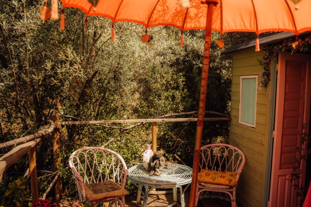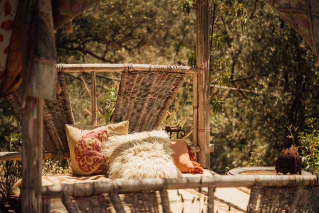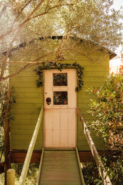 Your treehouse hideaway. Hidden among the olive and poplar trees, The Lovers’ Nook is our newest and most intimate retreat. Perched above the barranco, it feels like your own private world: candlelit interiors, a dreamy bed with views through the trees, and a little deck perfect for morning coffee.