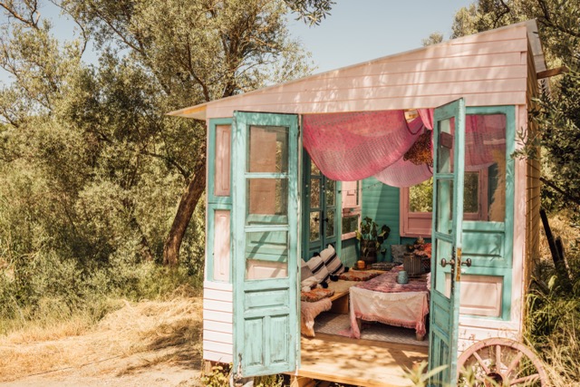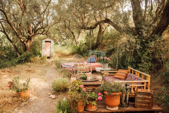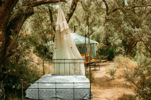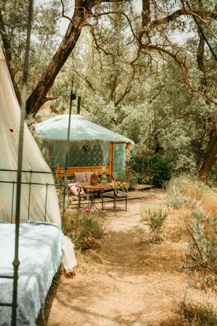 Shaded, serene, and full of charm. Nestled in its own little dingly dell beneath ancient olive trees, Yurt Lola is a tranquil hideaway made for rest and relaxation. She features soft earthy tones, a wood burner for cool evenings, and her own private deck surrounded by greenery.