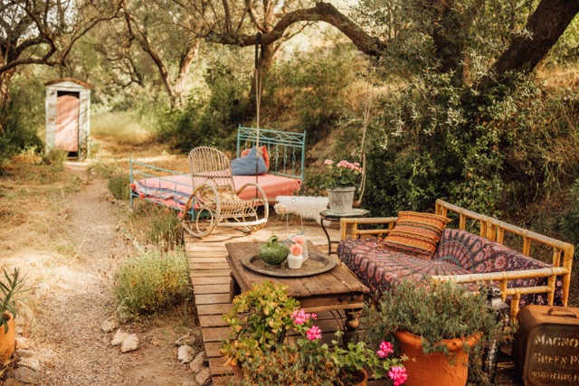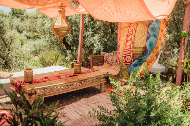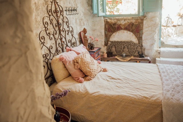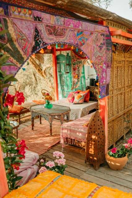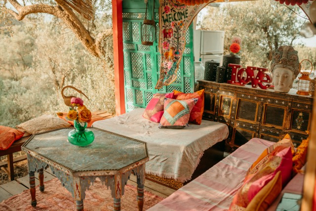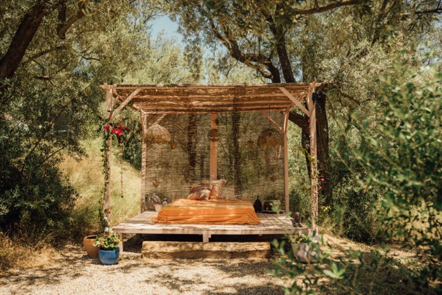For dreamers and stargazers. Tucked in the sheltered barranco under towering olive trees, Yurt Pomegranate has been lovingly refreshed with warm textiles, candlelight, and rustic touches. It includes a private seating area and a comfy outdoor bed for stargazing.